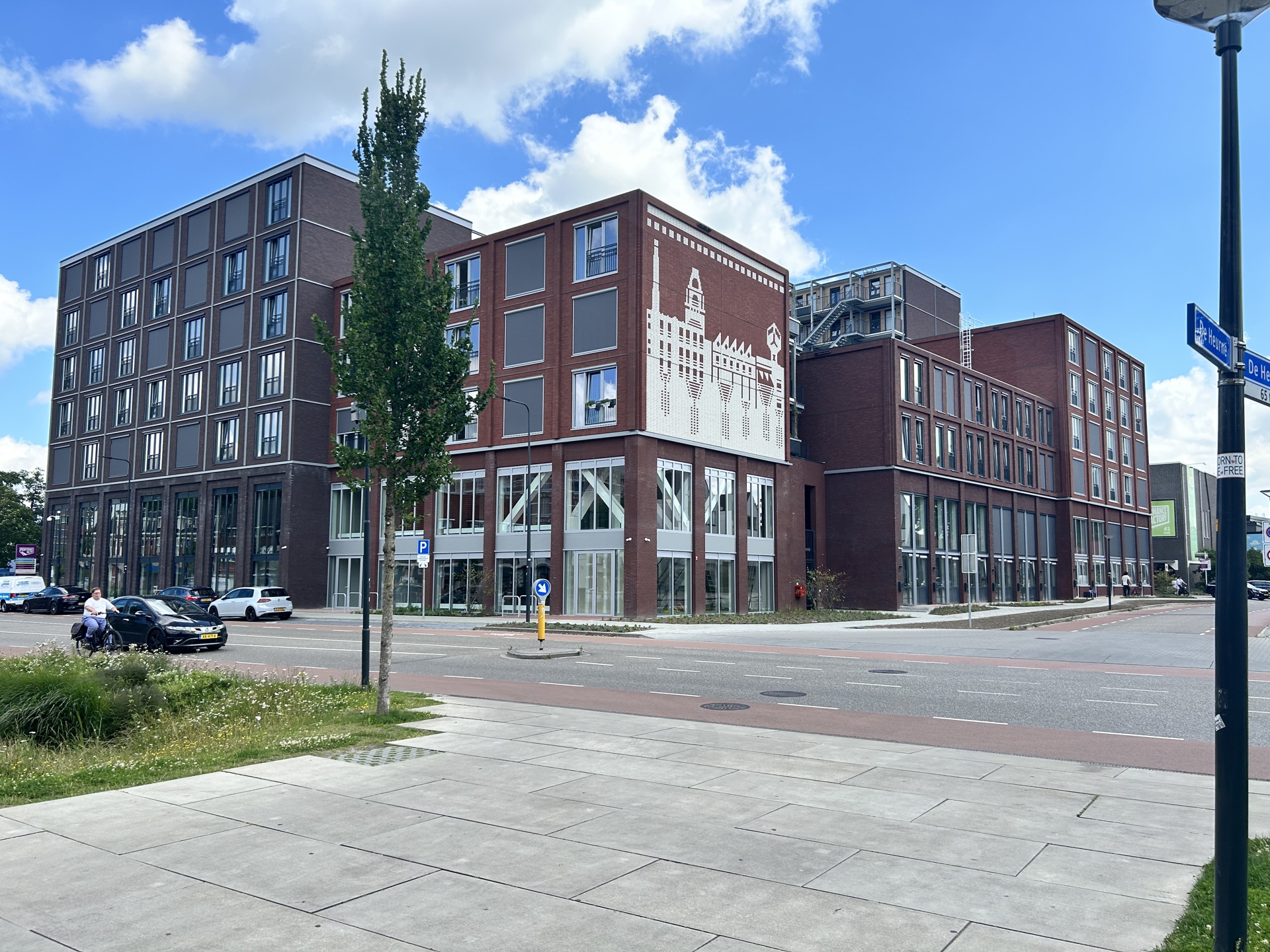 The building offers facilities tailored to the needs of starters, such as a parcel locker, a shared meeting space, flexible workspaces and a laundry bar. There is a green inner courtyard with a community garden and a shared pavilion with a kitchen and rooftop terrace.